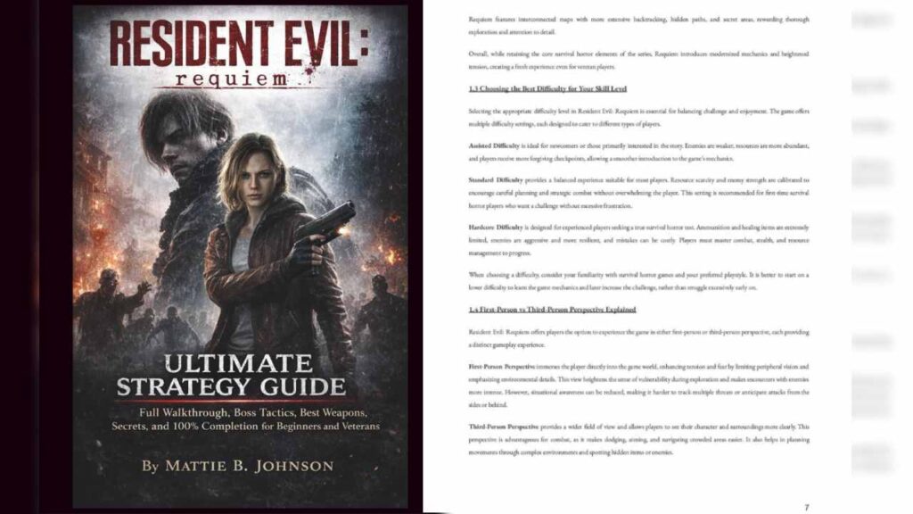 Published under the author name Robert F. Recinos, “RESIDENT EVIL REQUIEM COMPLETE GAME GUIDE” is a 105-page fake strategy guide that claims to be a “step-by-step story walkthrough” with “weapon, combat, and boss strategies that actually work”. Inside the book, the so-called “story overview” reads as such: