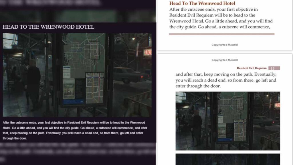 Another book, “RESIDENT EVIL REQUIEM OFFICIAL COMPLETE GAME GUIDE”, followed by more SEO-jargon, was published on February 26, 2026 under the name Akibara G Shohei. While a reasonable walkthrough of the game’s first section, it’s also a direct copy of a walkthrough from website Into Indie Games including the site’s screenshots. Of course, the book uses AI-generated cover art with fake gameplay images, and doesn’t include any content from later parts of the game which was still under embargo for walkthroughs. The book was re-published on March 3, 2026 with the same content under the name “LARAVEN RHINEHART”.