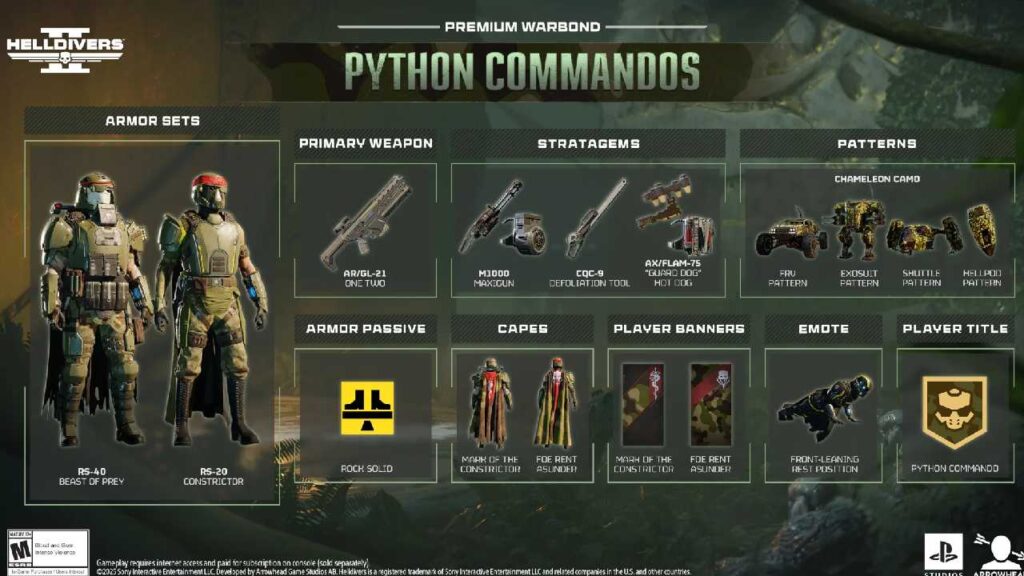 โHelldivers, high-ranking officials in the Ministry of Defense have accused you of being the best,โ reads the warbondโs new synopsis. โAnd if youโre the best, then youโre going to need to be outfitted with the best, which is why the Ministry has fast-tracked the deployment of the Python Commandos Premium Warbondโarriving to your Super Destroyers on December 2!โ