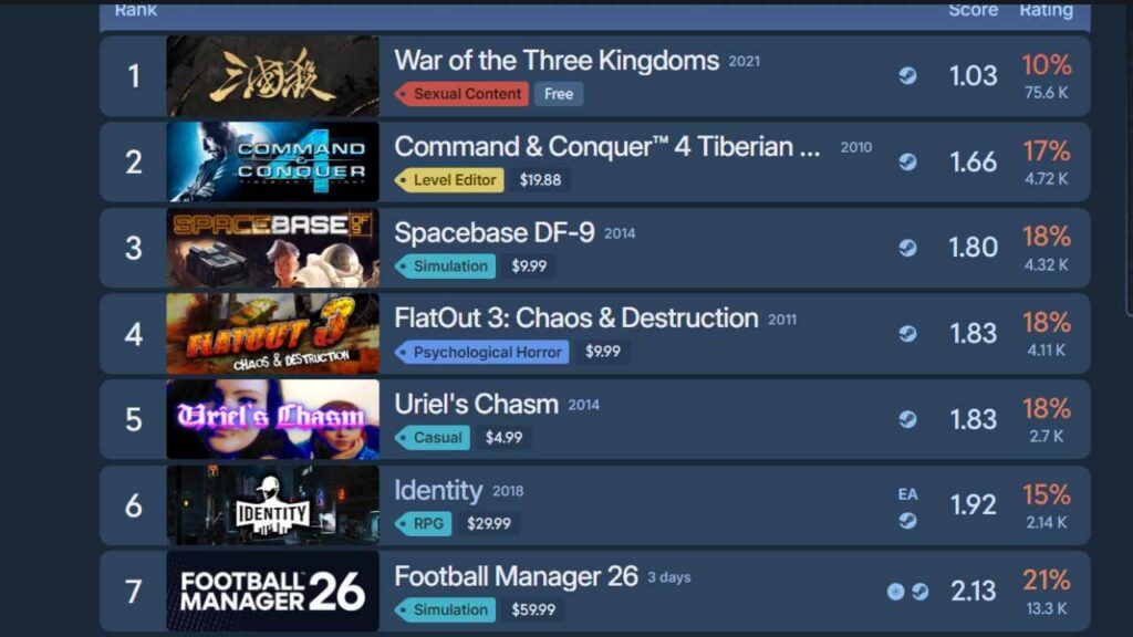 Via tracking website Steam 250, Football Manager 26 has hit almost rock-bottom with the game becoming the 7th lowest-rated games on Steam at the time of writing. Resting between Mobile Suit Gundam Battle Operation 2 and 6-year-old MMO Identity, the new management game has dropped to a historic low for the franchise.