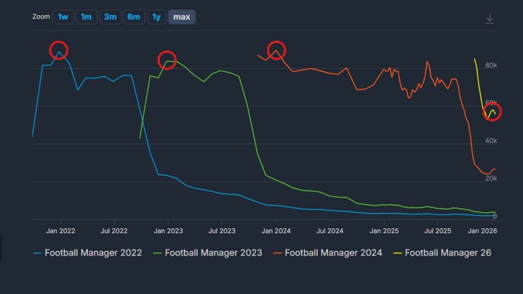 The seriesโ annual cycle and single-player focus usually allow it to retain stronger mid-season numbers than most comparable PC games. That is why FM26 looks different. It is not falling away dramatically. It is simply not bouncing back. The line is flatter at precisely the point where history says it should be climbing.